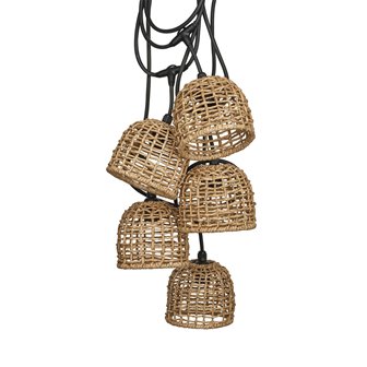 Wyjątkowa girlanda ogrodowa w komplecie z wiklinowymi abażurami Cebu mini. Girlanda zewnętrzna z abażurami w stylu boho to idealny sposób na wprowadzenie wyjątkowego, wakacyjnego nastroju. Zestaw składa się z solidnego, czarnego przewodu oraz pięciu misternie plecionych abażurów Cebu, wykonanych z naturalnego materiału. Organiczna struktura splotu w połączeniu z technicznym wykończeniem kabla tworzy modny kontrast, który doskonale wpisuje się w styl boho, ekologiczny oraz skandynawski.