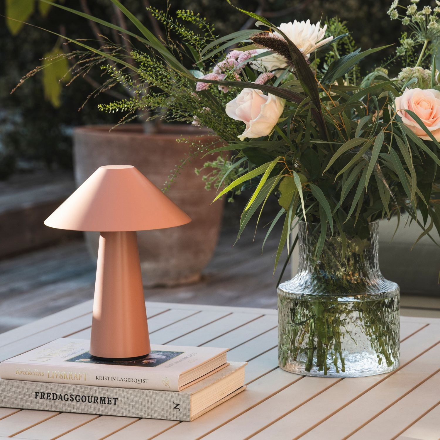 Cannes to minimalistyczna lampa bezprzewodowa, która łączy nowoczesną formę dwóch stożków z wyjątkową funkcjonalnością. Wykonana z matowego poliwęglanu w odcieniu brudnego różu, jest niezwykle lekka i odporna na uderzenia, co czyni ją idealnym wyborem zarówno do wnętrz, jak i do ogrodu. Dzięki klasie szczelności IP44 oprawa jest odporna na warunki zewnętrzne, choć dla zachowania jej trwałości zaleca się przechowywanie jej wewnątrz pomieszczeń.Lampa oferuje funkcję bezstopniowego ściemniania, sterowaną intuicyjnie za pomocą dotyku na szczycie klosza. Pozwala to na płynną regulację natężenia ciepłego światła (2700K) o maksymalnym strumieniu 100 lm, przy bardzo niskim zużyciu energii wynoszącym zaledwie 1,5W. Wbudowany akumulator o pojemności 4000mAh zapewnia do 8 godzin pracy przy pełnej jasności, a przy niższym natężeniu światła czas ten ulega znacznemu wydłużeniu.
