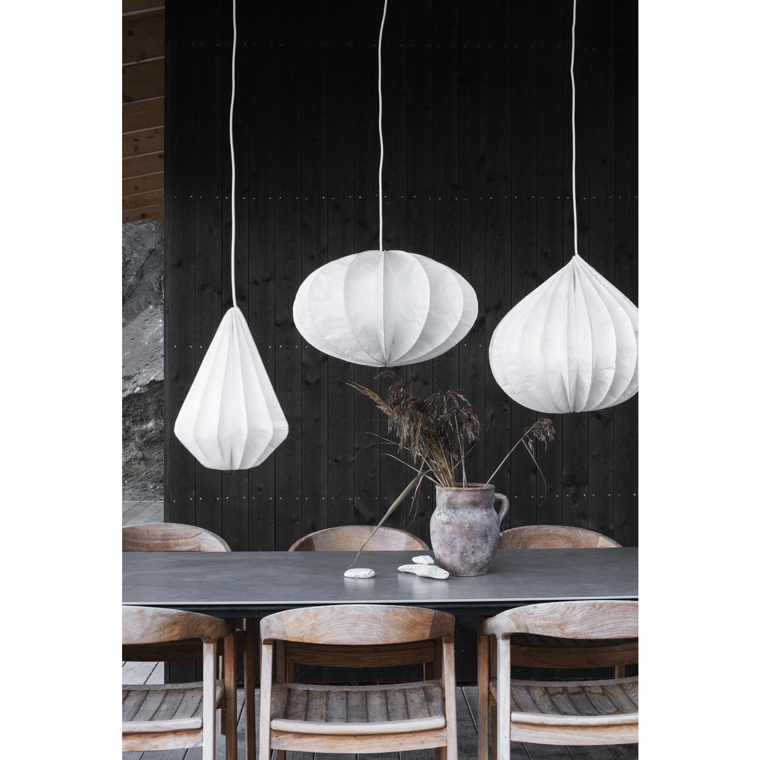 Włączone światło podkreśla unikalne ułożenie włókien materiału, tworząc niezwykłą, magiczną atmosferę. Jesteśmy pewni, że lampa Pinecone zwróci na siebie uwagę nie tylko oryginalnym kształtem, ale również nietuzinkowym materiałem, który po podświetleniu daje wyjątkowy efekt. Ta biała lampa wisząca świetnie sprawdzi się na zewnątrz - dołączamy do niej białą oprawkę z kablem o długości 5m odporną na warunki atmosferyczne (kabel zakończony jest wtyczką).